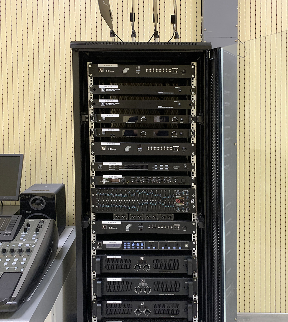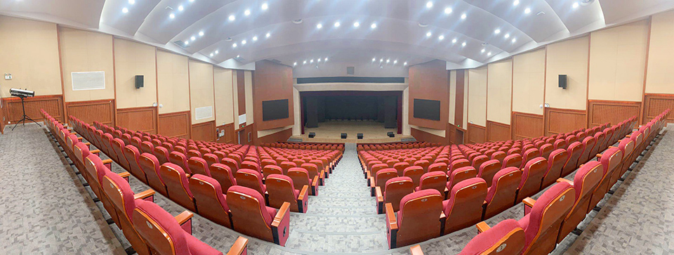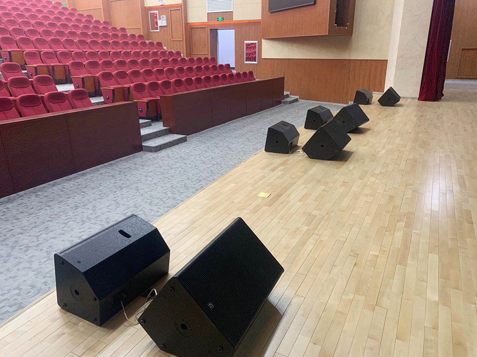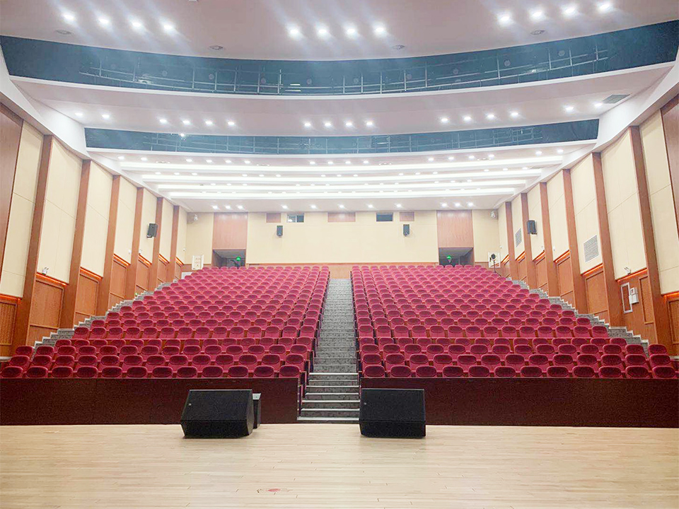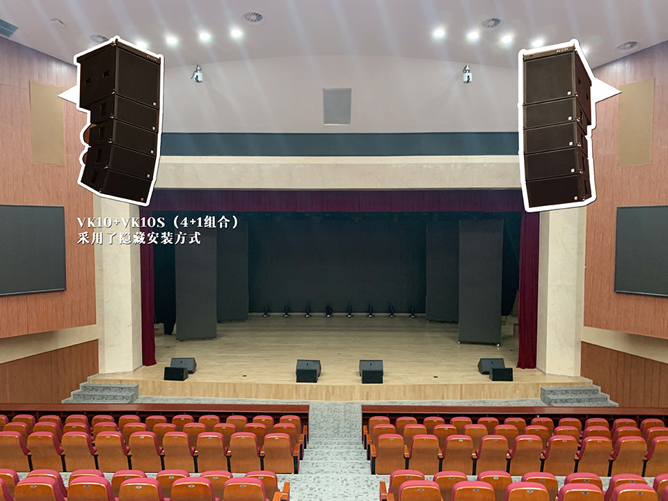文體活動中心的報告廳選用了銳豐智能"RF"VK10線陣列揚聲器系統(tǒng),左右聲道的主擴聲為單10寸線陣列音箱VK10+VK10S(4+1組合),中置聲道的擴聲音箱采用了VK10(4只組合),主擴聲音箱采用了隱藏安裝方式,在滿足聽眾區(qū)有足夠高聲壓級和均勻度的同時,強指向覆蓋能有效避免了室內(nèi)強反射的情況出現(xiàn),達到較高的語言清晰度。