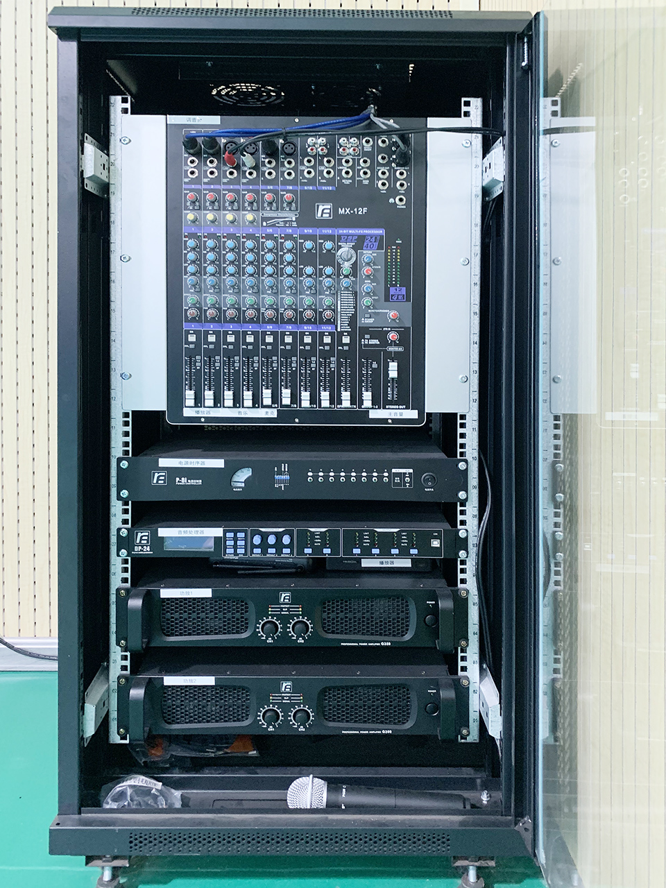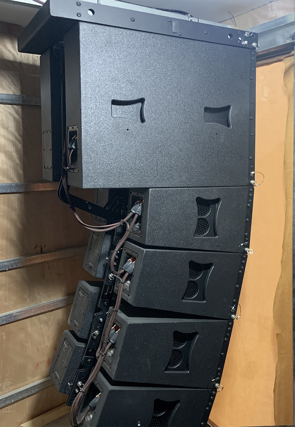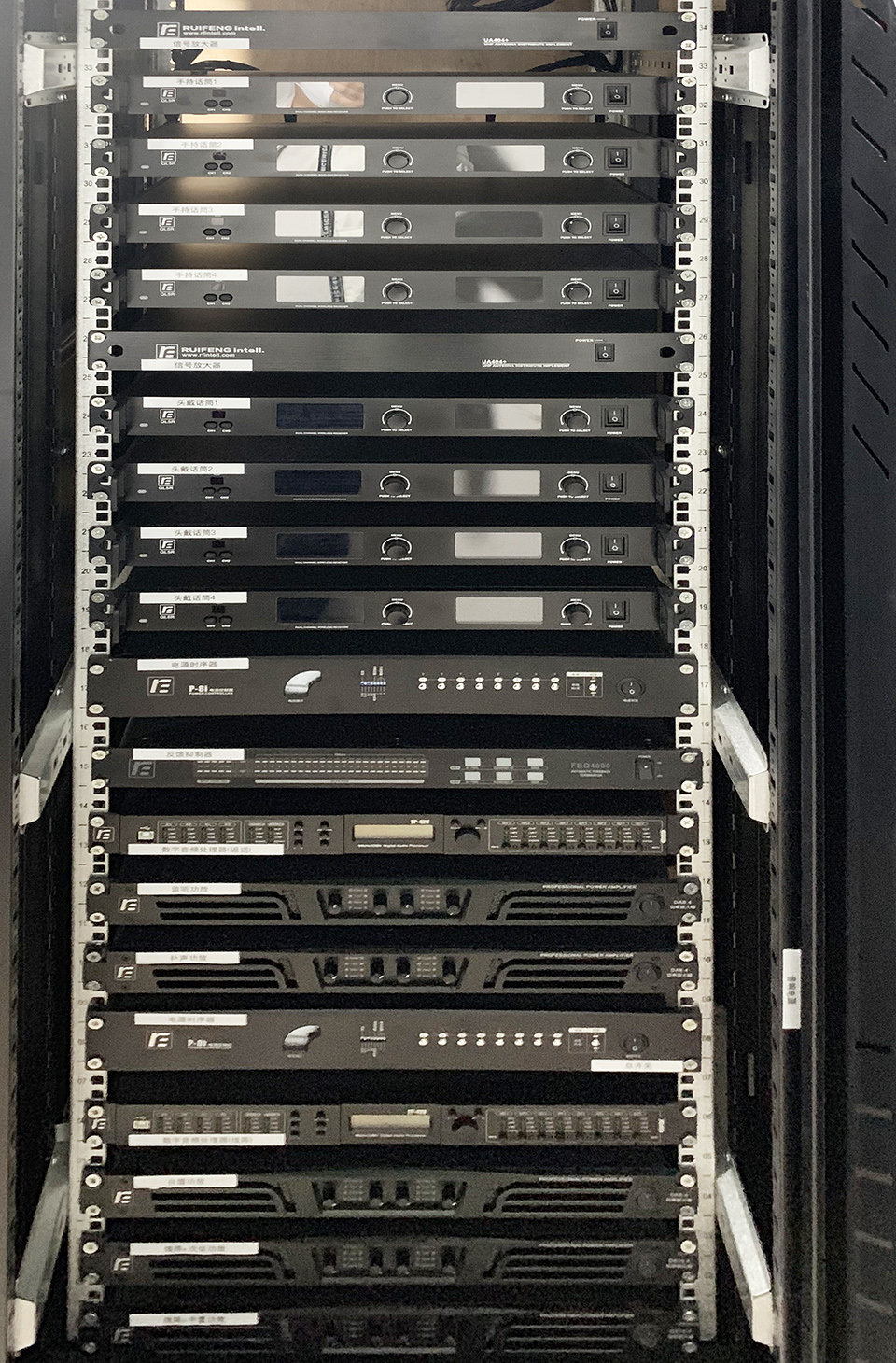文體活動中心的報告廳選用了銳豐智能"RF"VK10線陣列揚聲器系統(tǒng),左右聲道的主擴聲為單10寸線陣列音箱VK10+VK10S(4+1組合),中置聲道的擴聲音箱采用了VK10(4只組合),主擴聲音箱采用了隱藏安裝方式,在滿足聽眾區(qū)有足夠高聲壓級和均勻度的同時,強指向覆蓋能有效避免了室內(nèi)強反射的情況出現(xiàn),達到較高的語言清晰度。