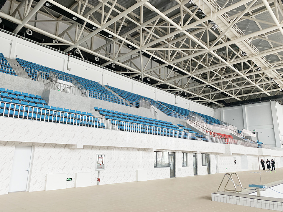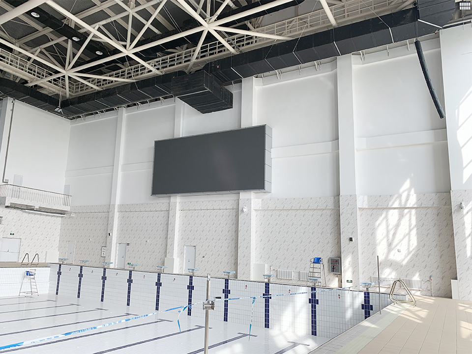游泳館采用矩形平面布局,地上建筑面積約為7800平方米,建筑占地約為5500平方米,設(shè)計有座位數(shù)1500座,主要分為國際標準50M*25M泳池、標準25M*21M熱身池、健身訓(xùn)練用房和辦公用房三大分區(qū),相對獨立,也有各自的獨立出入口。主體一層,局部三層,熱身池在非比賽時可以兼做市民用泳池進行使用?,F(xiàn)場采用了"RF"L16-CI 4×5寸(20個喇叭單元)同軸線陣音柱音箱、MQ-12CP單12寸同軸防水兩分頻音箱以及周邊設(shè)備等產(chǎn)品。