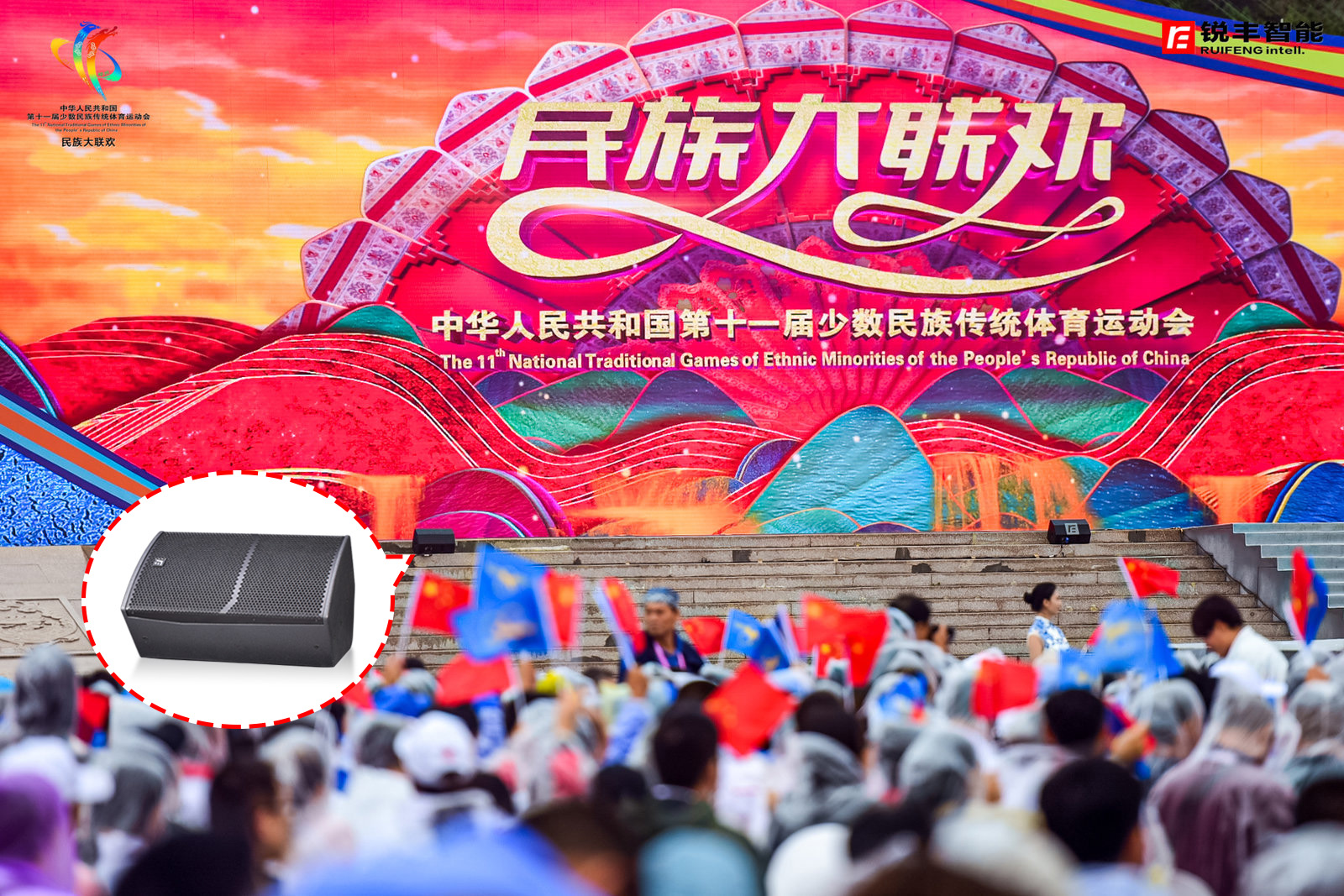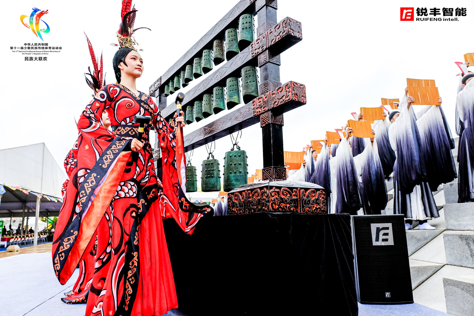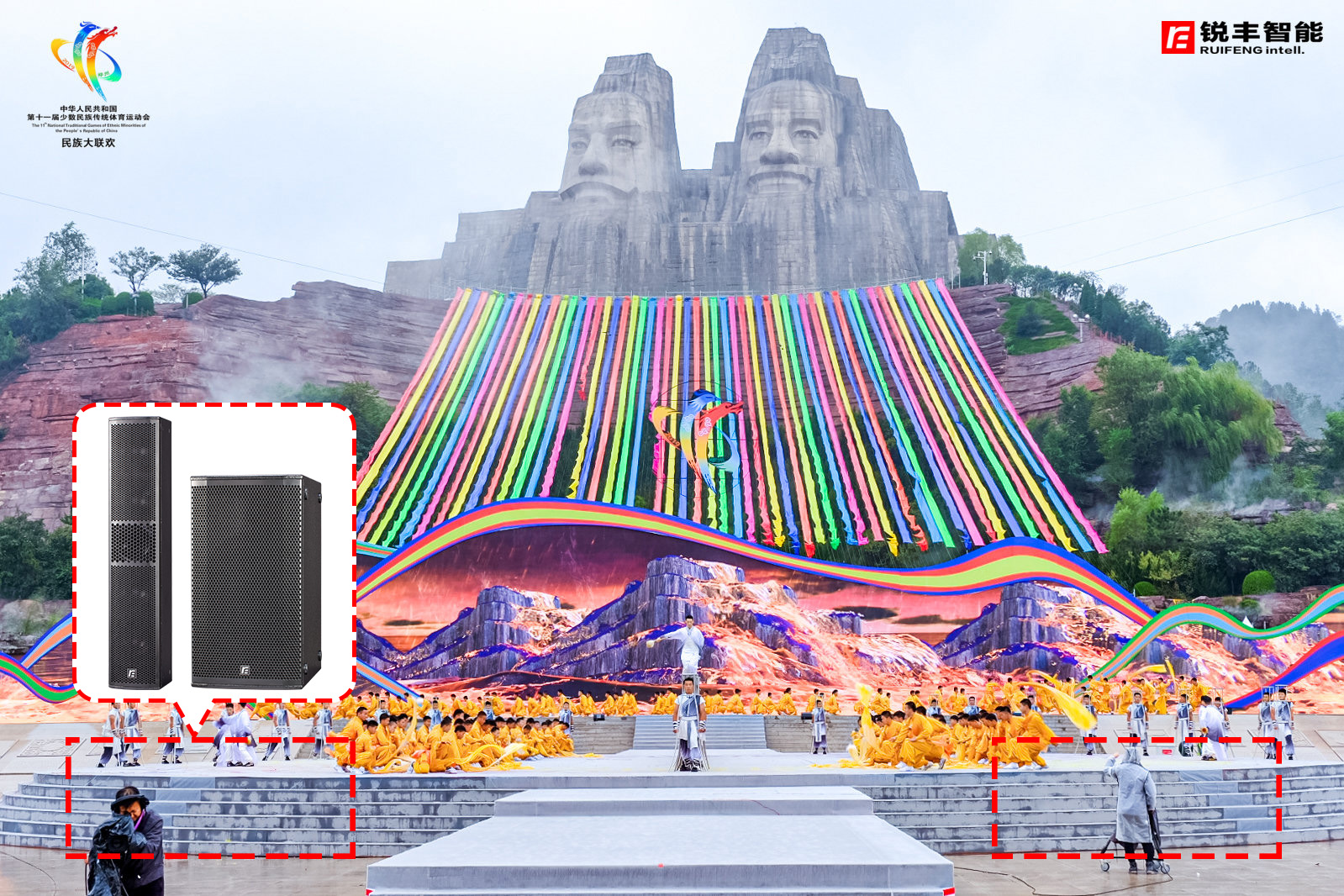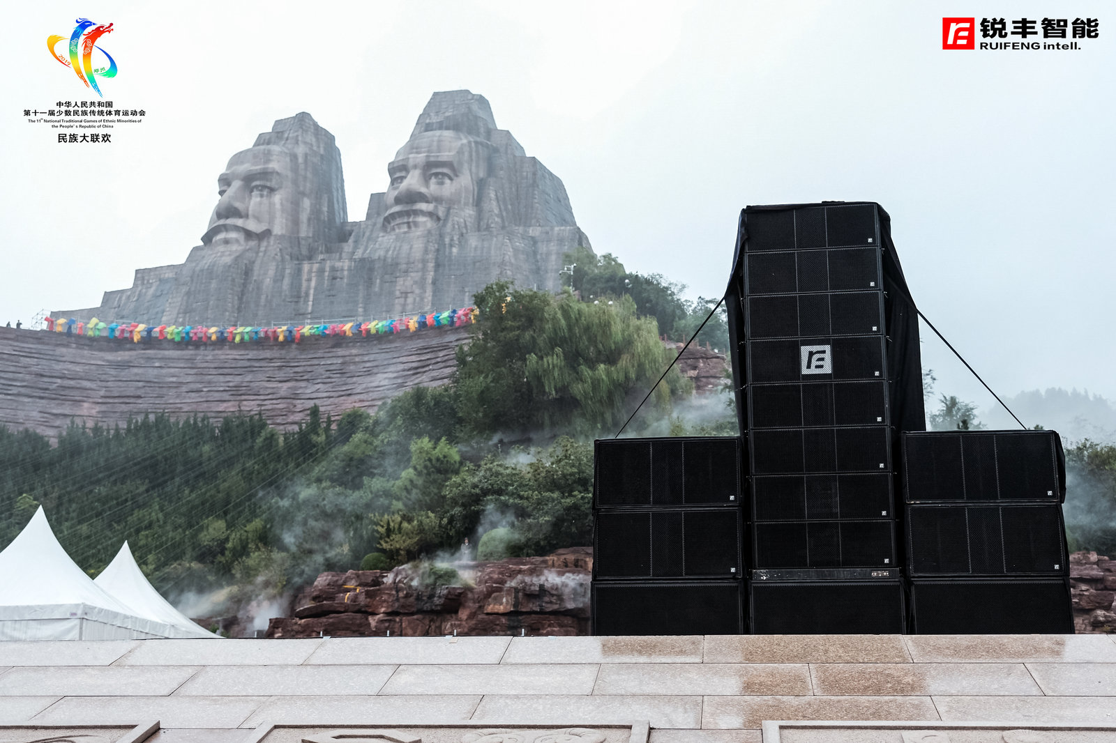民族大聯(lián)歡由著名音響設(shè)計師——宋多多老師擔任音響總設(shè)計,音響總監(jiān)為宋仁一老師。由銳豐智能為音響技術(shù)團隊,現(xiàn)場采用了"RF"—GTS線陣列揚聲器作為主擴聲,ML迷你陣列揚聲器、TX多功能系列揚聲器、以及周邊設(shè)備等產(chǎn)品。