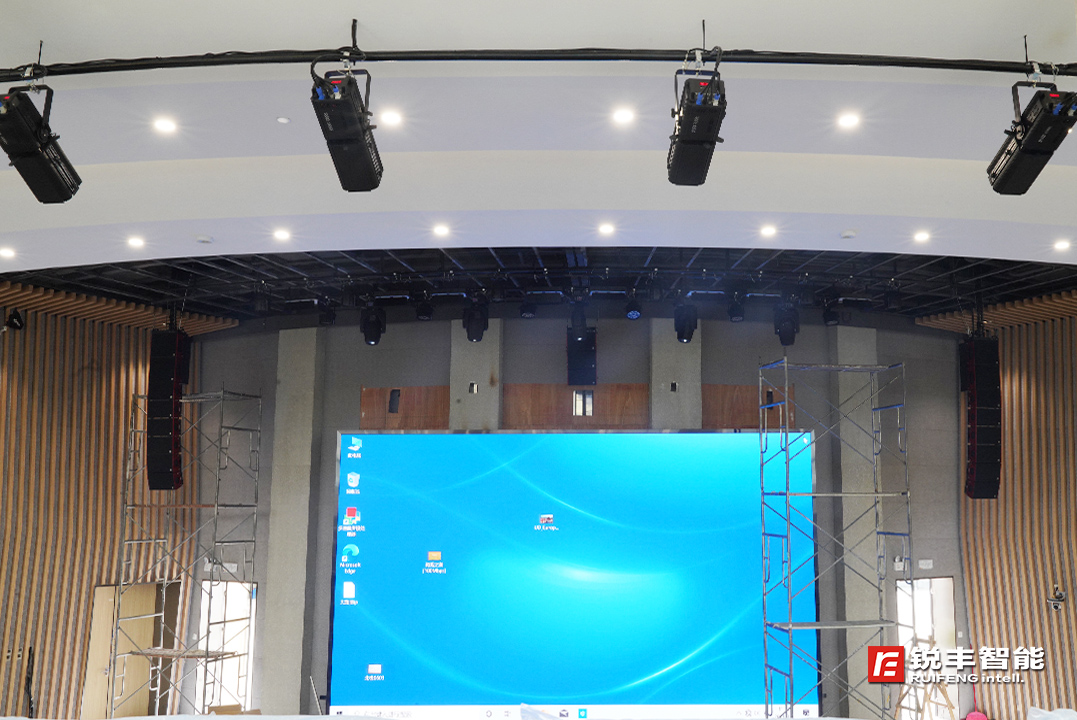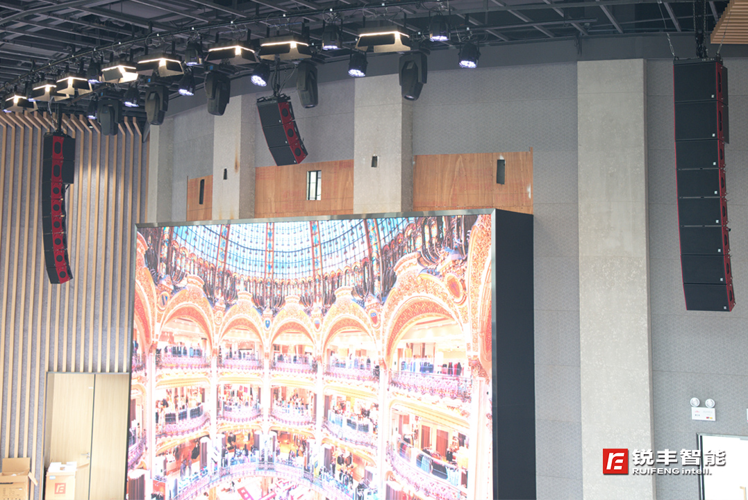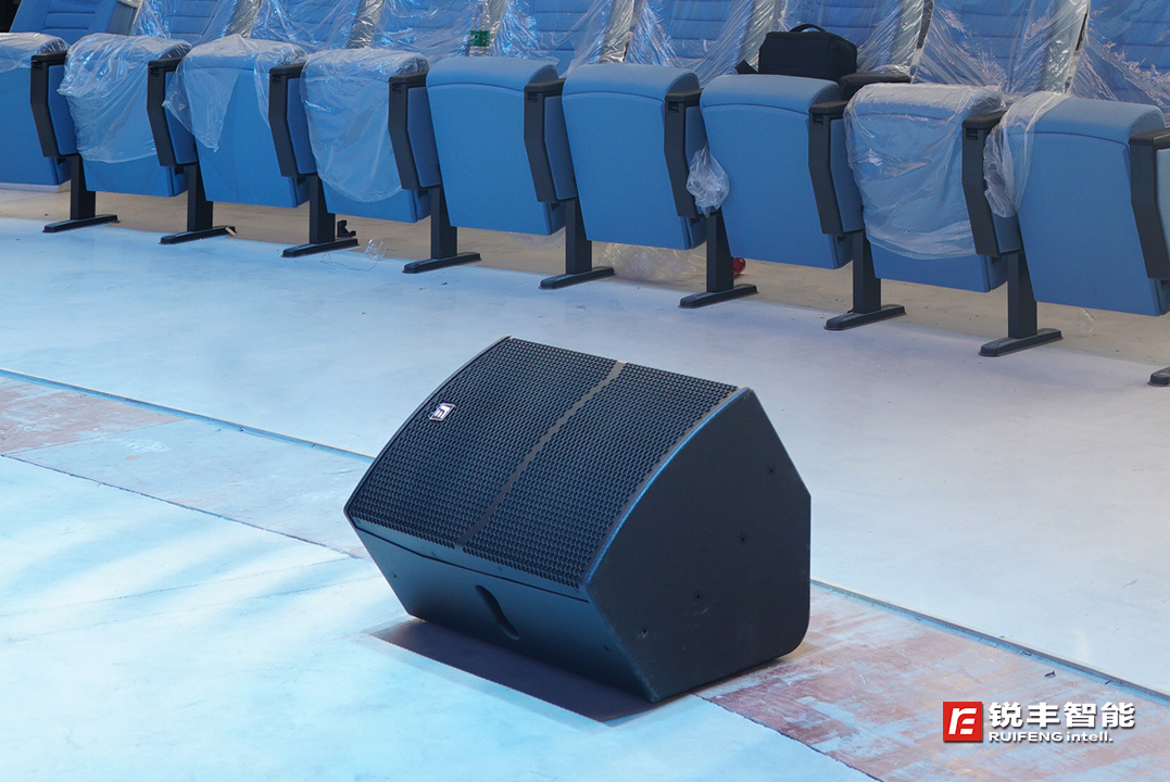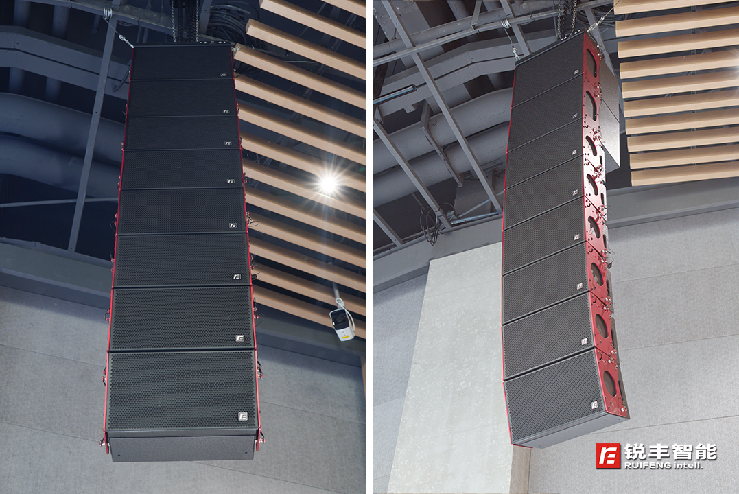 擴聲系統(tǒng)采用了"RF"全新推出的微型線陣列音箱AMOS"阿莫斯”,它擁有高清晰度細膩的音質,小巧輕盈的箱體完美地與路演廳裝修風格融合為一體。觀眾區(qū)主擴聲音箱為左、中、右聲道設計,左右聲道音箱采用了每組6只AMOS全頻線陣列音箱+2只AMOS SUB次低頻線陣列音箱,中置聲道音箱采用了1組3只AMOS全頻線陣列音箱,舞臺流動返聽音箱采用了2只TX12全頻音箱。