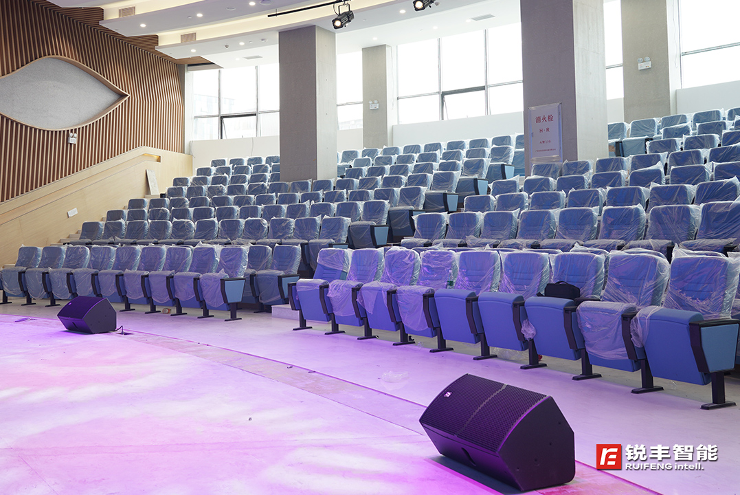 一層路演廳的室內空間為扇型布局設計,舞臺設在扇形短弧形的一端,觀眾席為扇形階梯式向長弧形的一端分布,結合室內良好的建聲設計,為擴聲系統(tǒng)提供了非常優(yōu)越的條件。