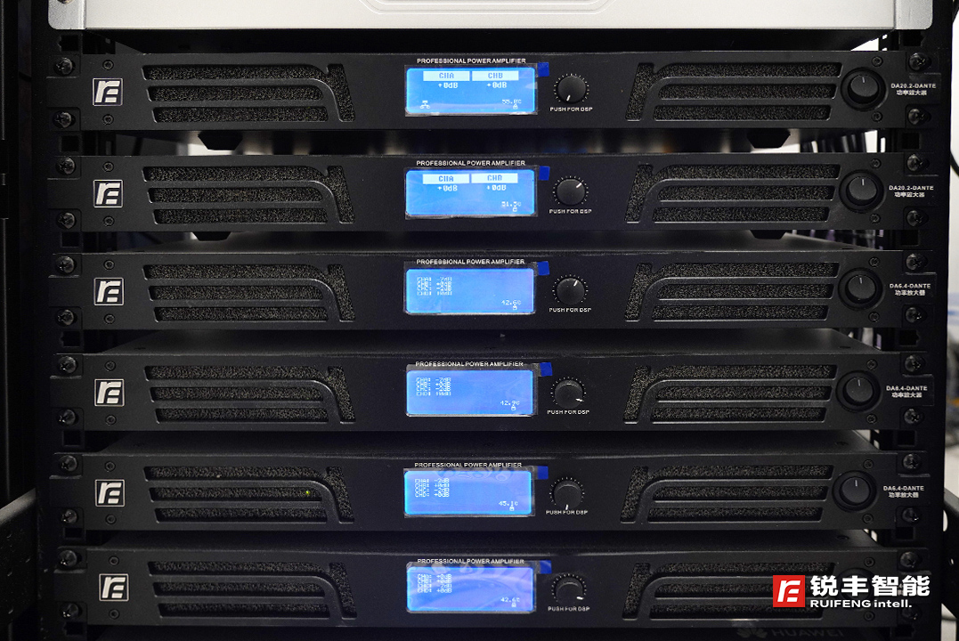 為了打造適應多模式多變化的新型數字化擴聲系統(tǒng),設計充分考慮了信號傳輸的安全、高效、兼容性等特點,核心控制處理設備方面,銳豐智能采用了集DSP數字信號處理、Dante數字信號(主備)+模擬信號自動切換熱備份、網絡監(jiān)控等功能于一體的"RF"DA-Dante數字功放,配置了P-8I電源時序器及周邊處理設備等。