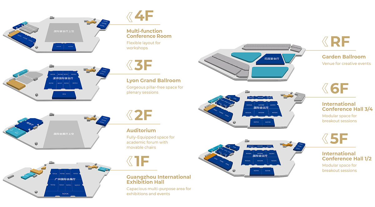 各個(gè)多功能會(huì)議廳、宴會(huì)廳分布于會(huì)議中心的二至六層,面積從30至210平方米不等,大部分采用落地玻璃窗設(shè)計(jì),自然采光??伸`活分隔或組合使用,隔音系數(shù)達(dá)52分貝,適合用作分會(huì)場或舉行中小型會(huì)議/宴會(huì),其擴(kuò)聲系統(tǒng)均采用了"RF"MQ-8C天花喇叭。