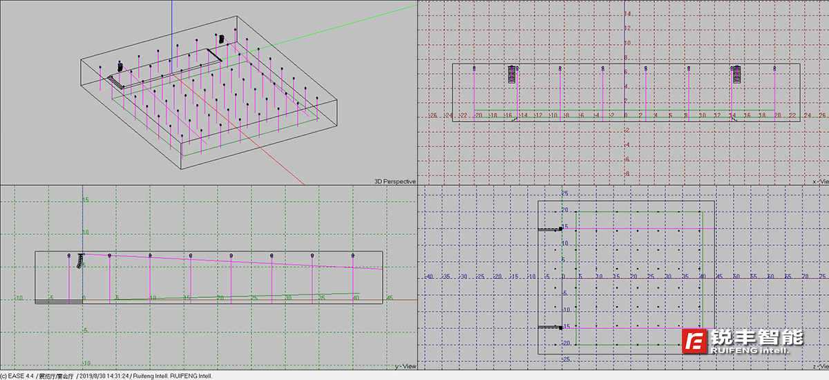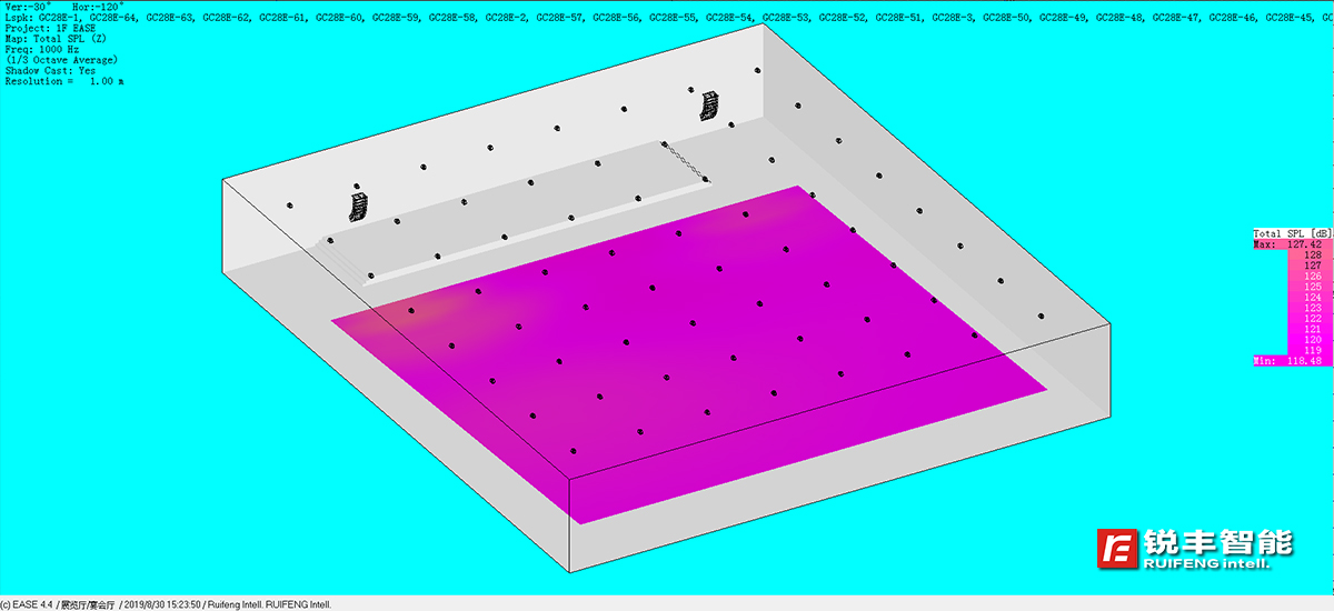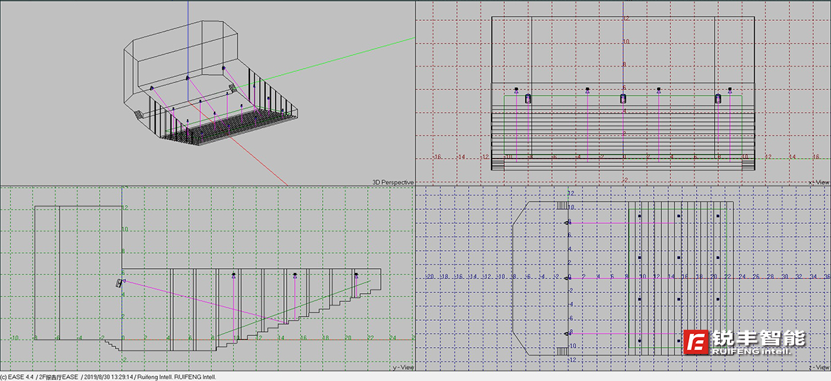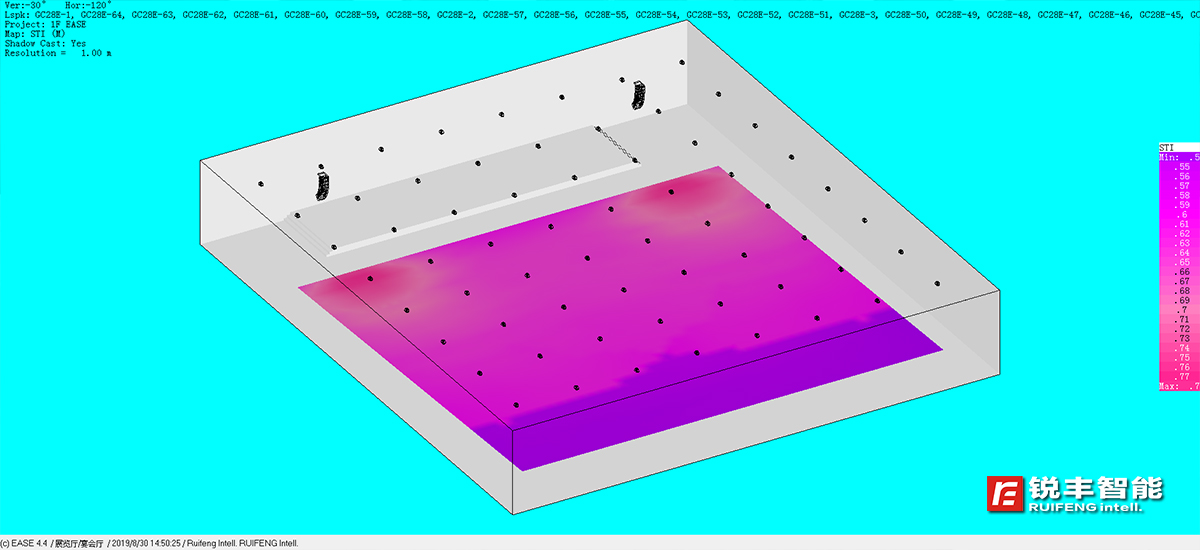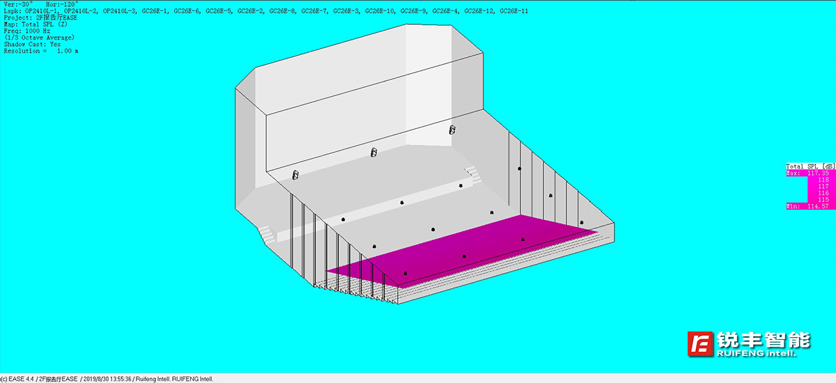 銳豐智能的工程師在進(jìn)行方案設(shè)計(jì)時(shí),根據(jù)甲方提供的圖紙和資料建立了供EASE使用的建筑3D模型,通過計(jì)算機(jī)對該報(bào)告廳進(jìn)行了EASE聲學(xué)模擬運(yùn)算,數(shù)據(jù)顯示:各頻段最大聲壓級(jí)、聲場不均勻度等各項(xiàng)指標(biāo)能滿足一級(jí)標(biāo)準(zhǔn)的要求,并有較大的動(dòng)態(tài)余量。