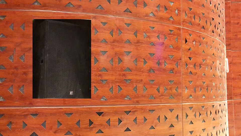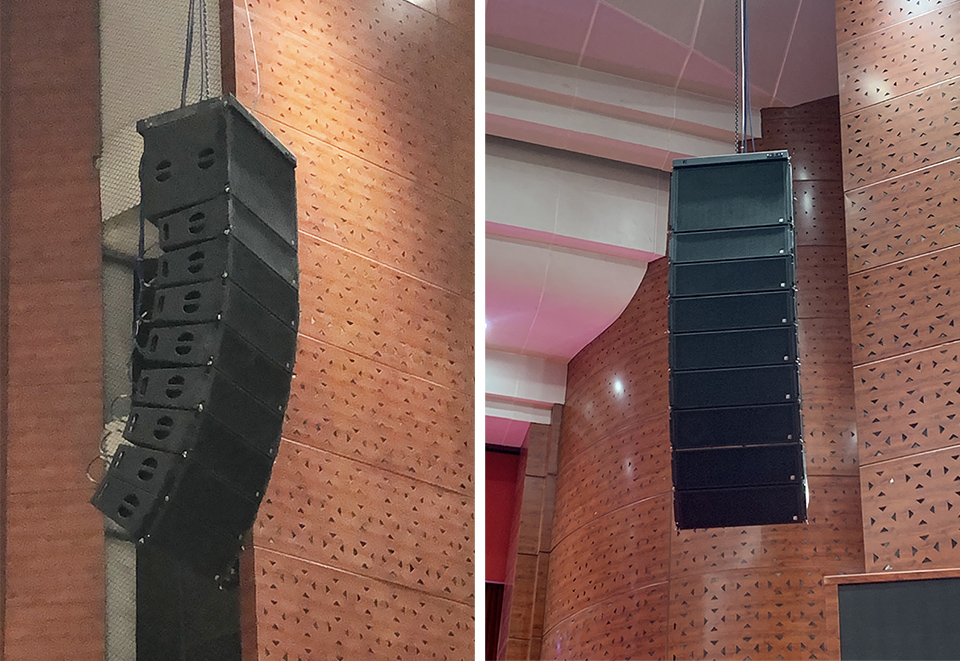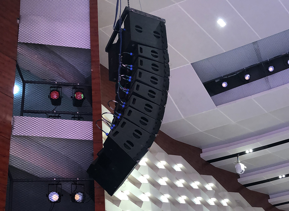 朔州市職工文化活動中心是一個集職工教育培訓(xùn)、會議報告、文化演出、才藝展示等功能于一體的多功能場所。分為一層觀眾區(qū)與二層看臺區(qū),主擴揚聲器使用了VK310線陣列揚聲器系統(tǒng),該款揚聲器中、高頻是同軸點聲源結(jié)構(gòu)設(shè)計,中頻號角由一個8寸釹磁中音單元驅(qū)動,在中頻單元前面同一個軸心安裝了1個2.55寸釹磁高音壓縮單元及平面波轉(zhuǎn)換器。該款揚聲器擁有90°的水平指向角度和10°的垂直指向角度,能讓聲音形成理想的線性聲學波陣面,對覆蓋區(qū)域?qū)崿F(xiàn)精確的投射,確保一層和二層觀眾區(qū)域都能得到均勻度一至及精確的聲音覆蓋。