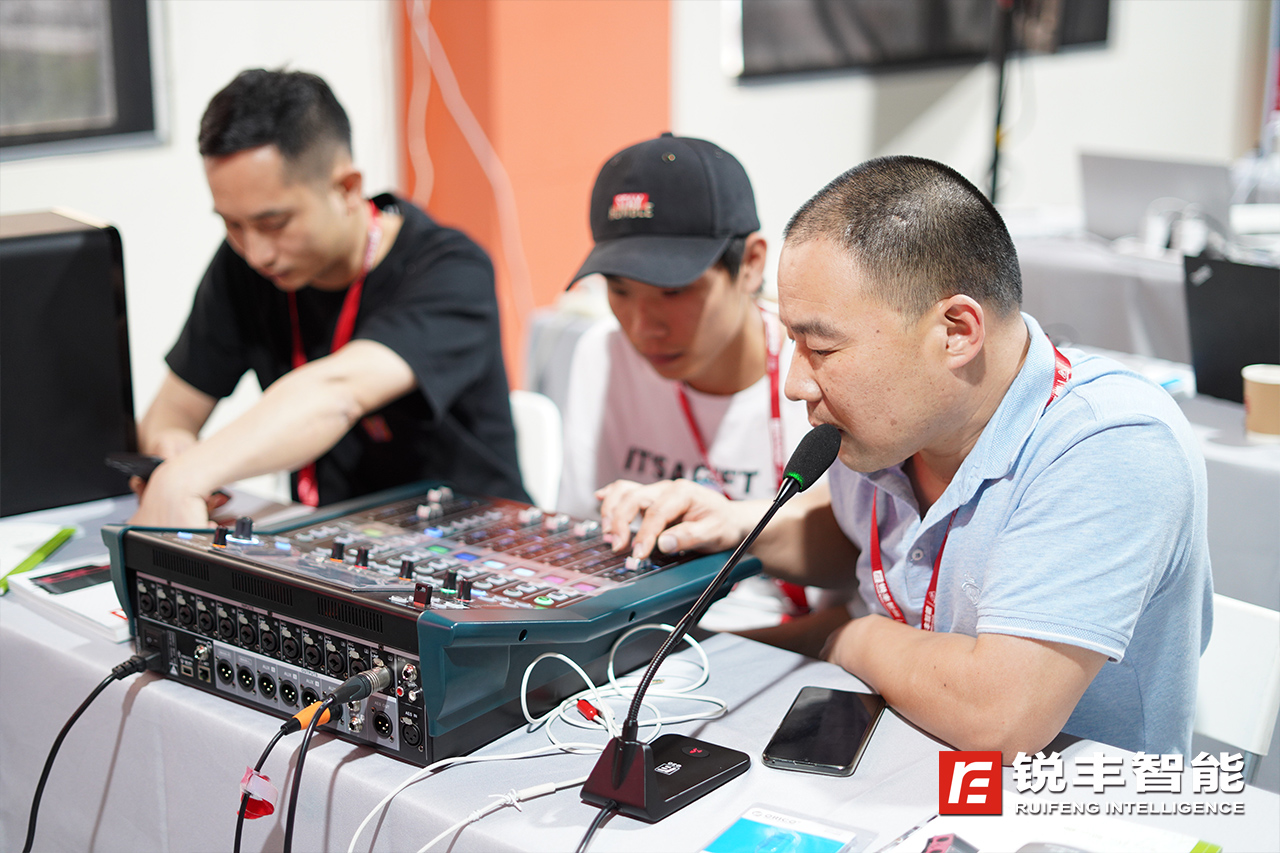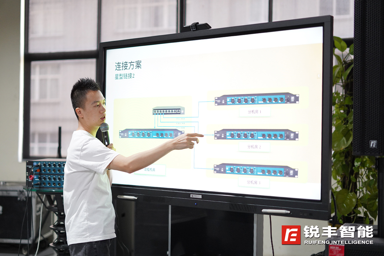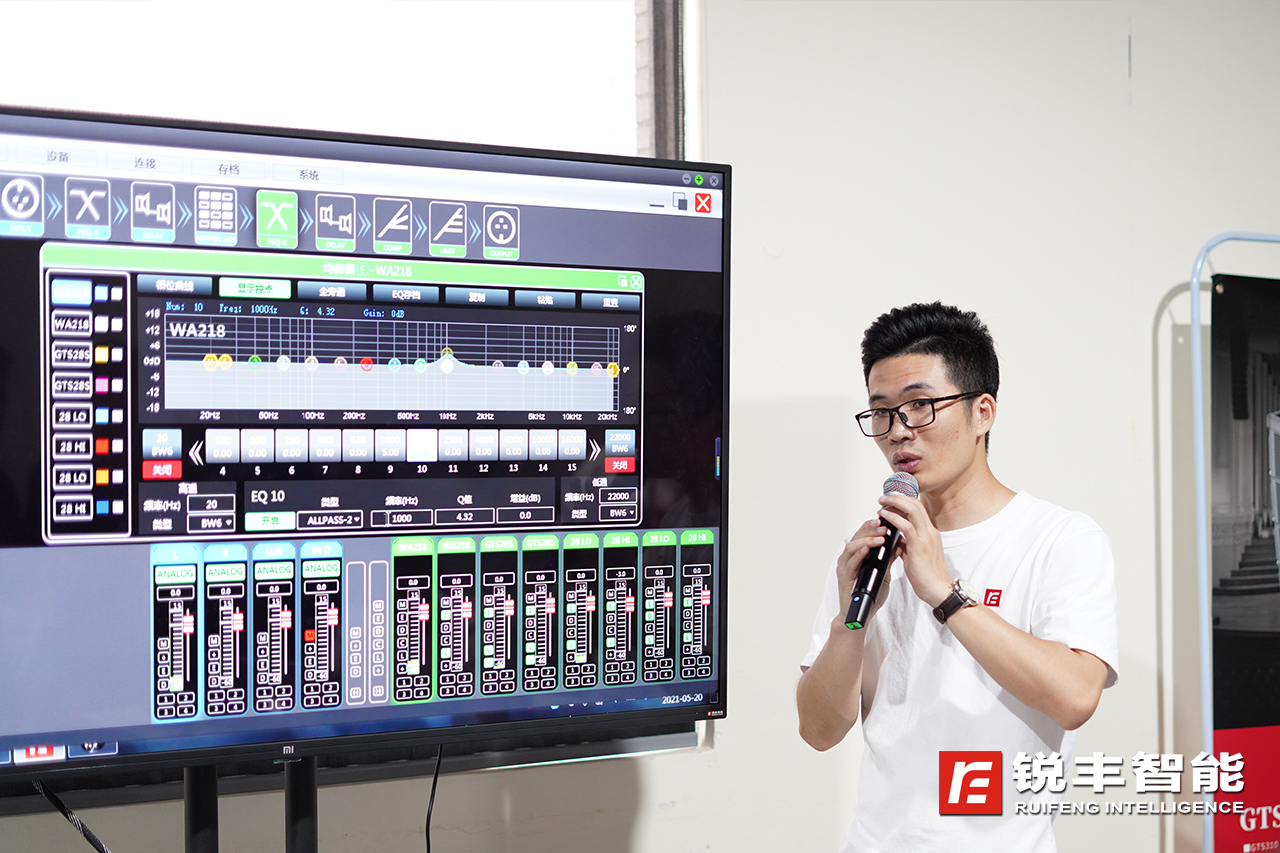 張工先為學(xué)員分享了《簡單方便的D04/D08 Dante數(shù)字音頻傳輸方案》,通過模擬傳輸和數(shù)字傳輸之間的鮮明對比,搭配科學(xué)合理的連接方案,讓學(xué)員充分了解了Dante數(shù)字音頻傳輸技術(shù)的實(shí)用性,為今后各種遠(yuǎn)程擴(kuò)聲系統(tǒng)的設(shè)計(jì)提供了參考方案。隨后,張工為學(xué)員分享了銳豐智能最新推出的SAP46智能空間聲學(xué)相位校準(zhǔn)器,并對教學(xué)現(xiàn)場的擴(kuò)聲系統(tǒng)進(jìn)行相位校準(zhǔn)演示,眾學(xué)員體驗(yàn)到了通過8192個最小相位FIR濾波器校準(zhǔn)優(yōu)化后的聲音,紛紛表示擴(kuò)聲系統(tǒng)的語言清晰度和音樂明晰度都有了顯著的提升。
